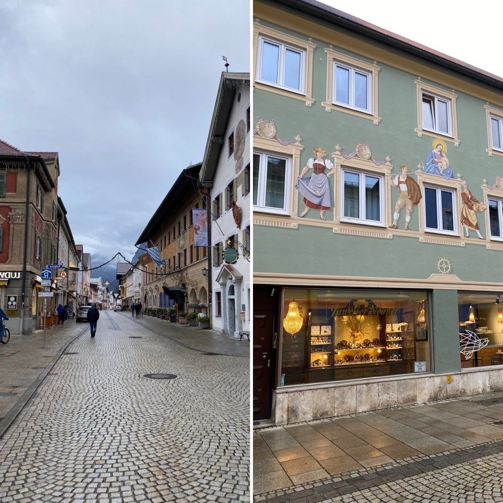 After our adventurous exploration of Partnachklamm, we make our way to Ludwigstraße, the main street of Partenkirchen. On a quiet, cloudy afternoon, the street feels peaceful, with fewer tourists and a soft, calming atmosphere. The colorful houses with their intricate frescoes on the facades stand out even more against the grey sky, their beauty highlighted in the diffused light.